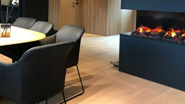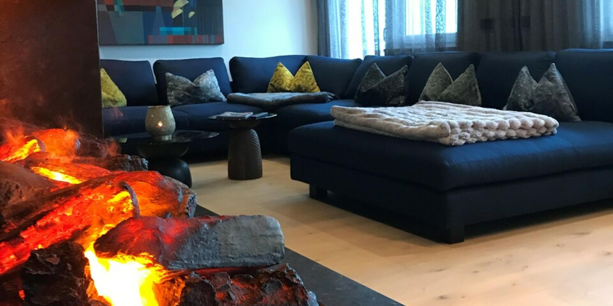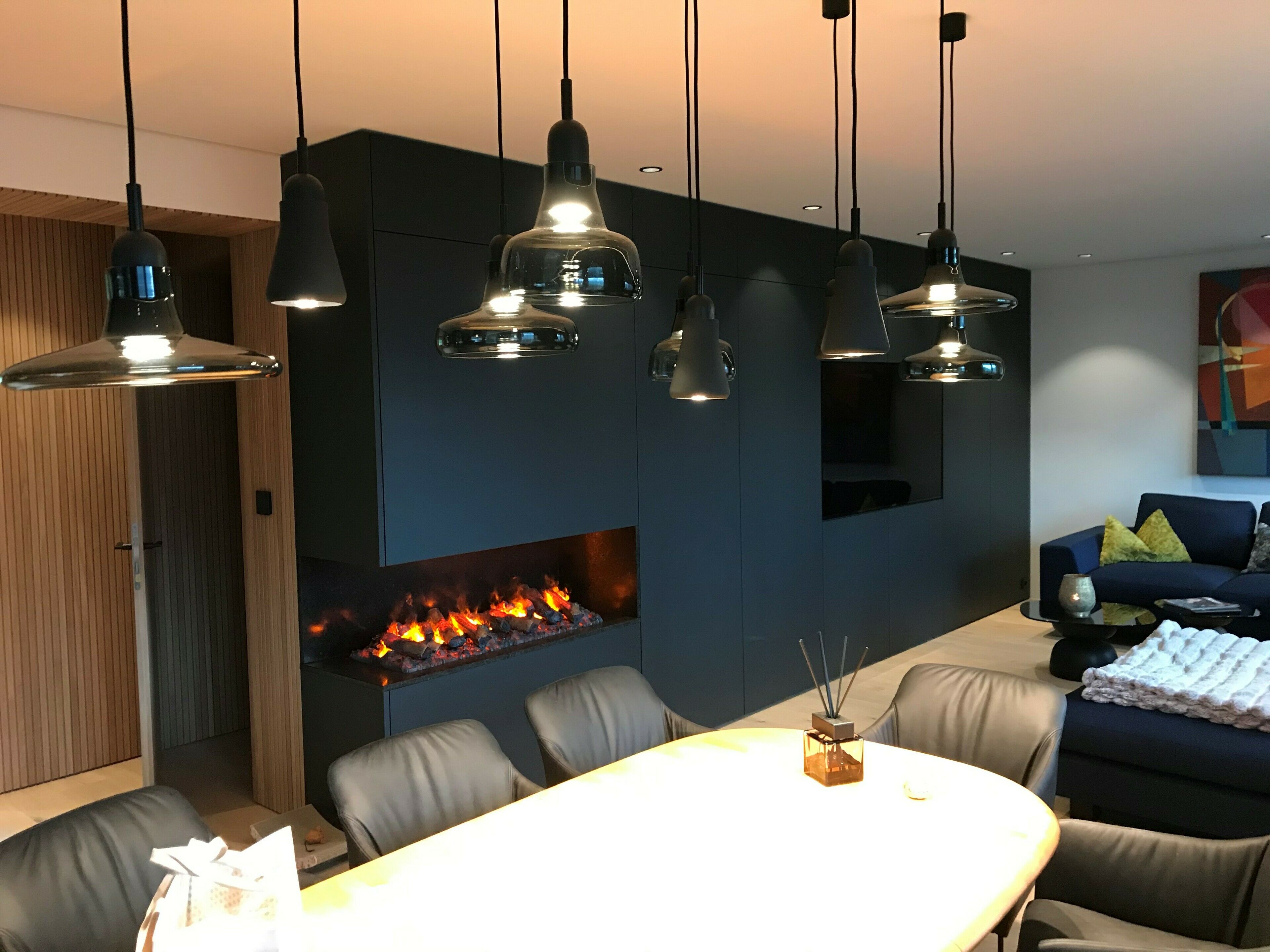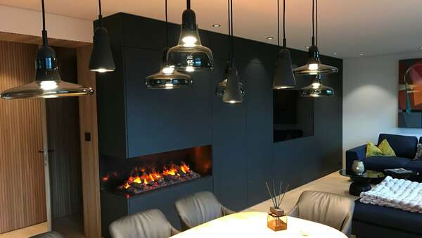 Der Wohnzimmerschrank inkl. elektrischer Feuerstelle wurde gleich wie die Küche mit Lackfronten mit dem speziellen Strukturlack ganz individuell angefertigt.