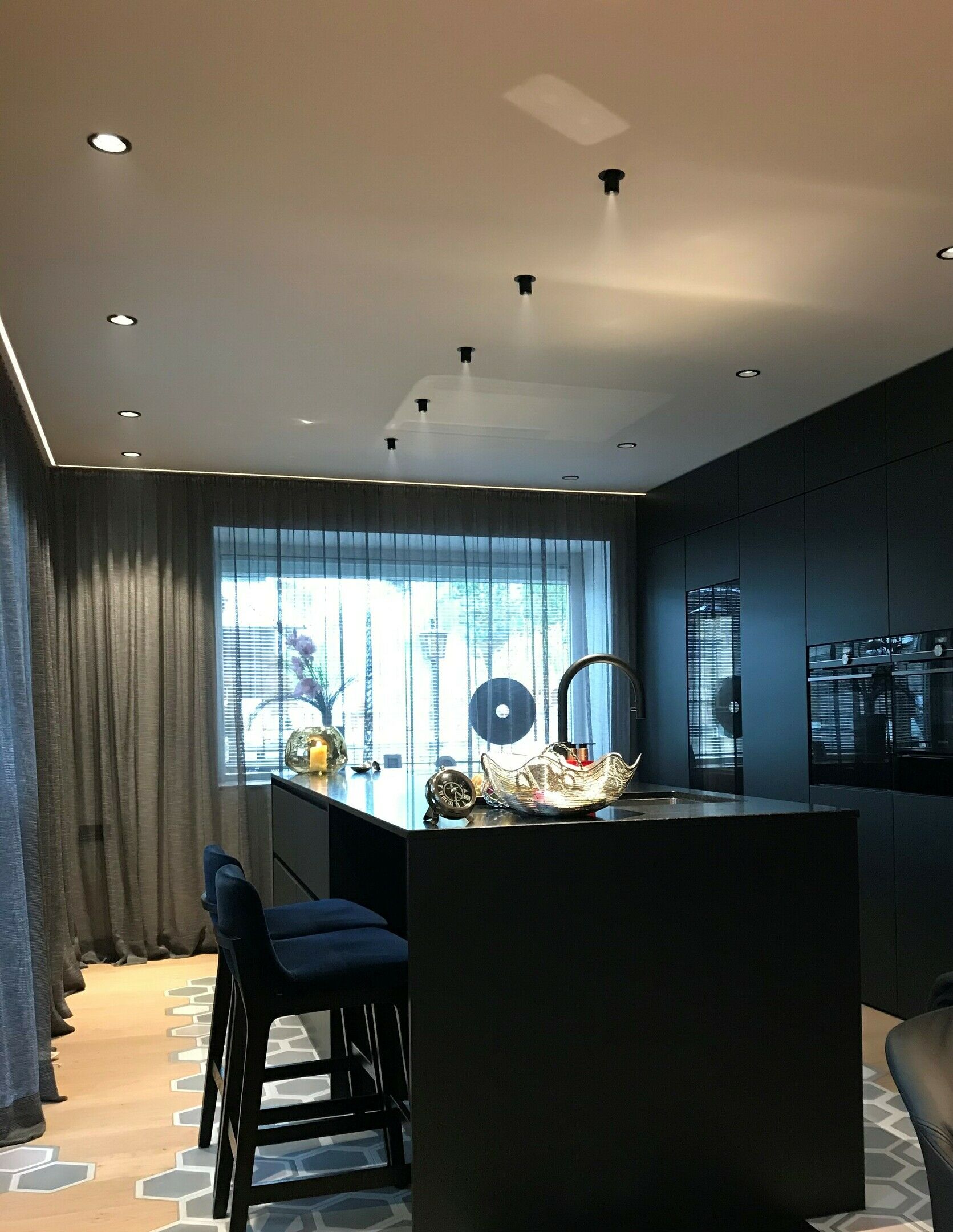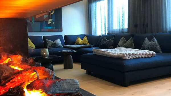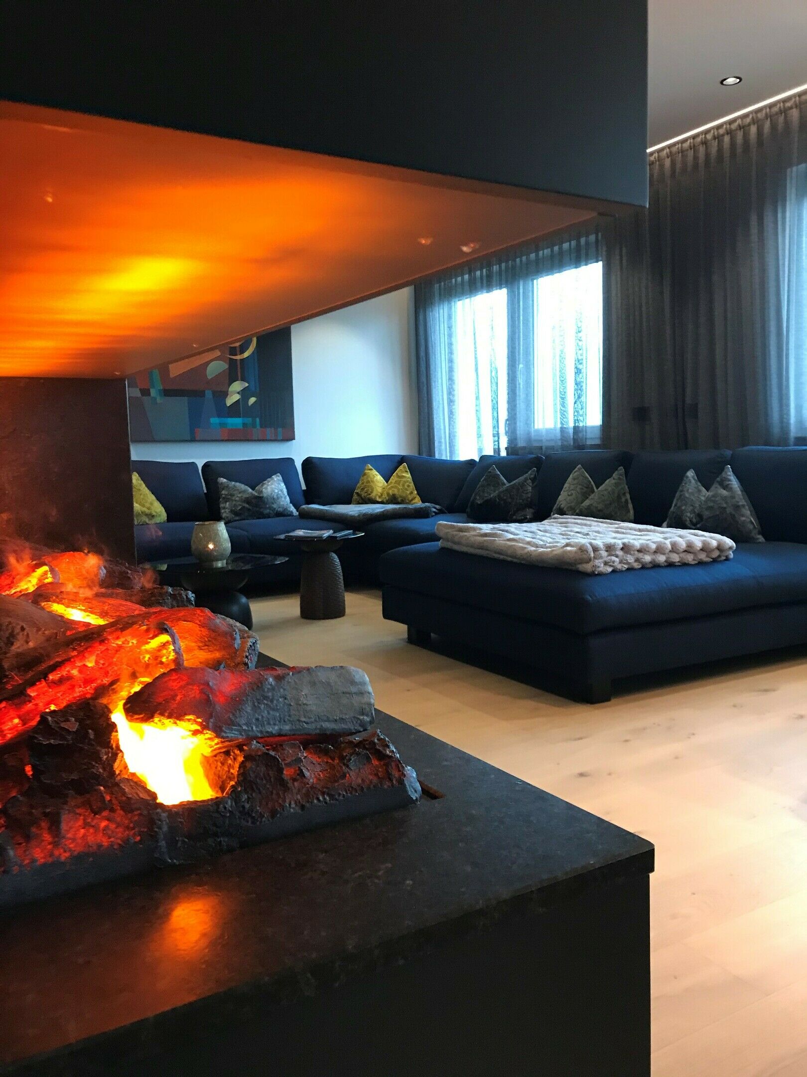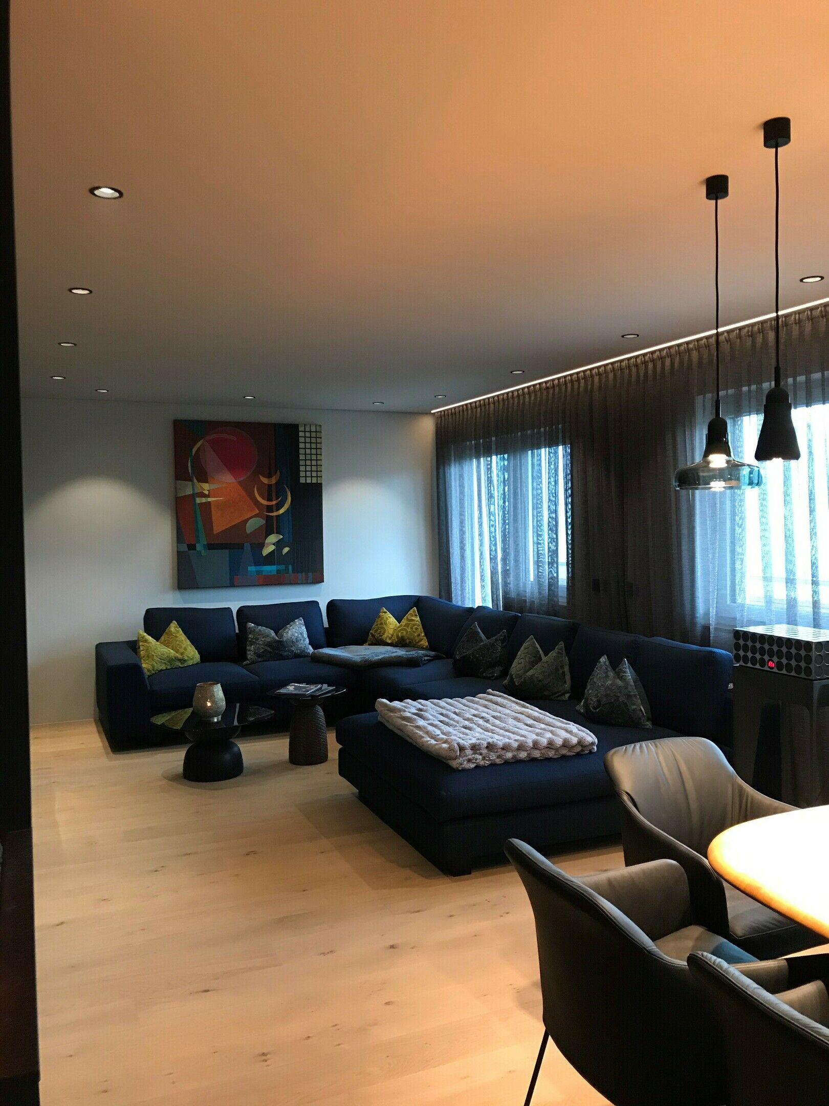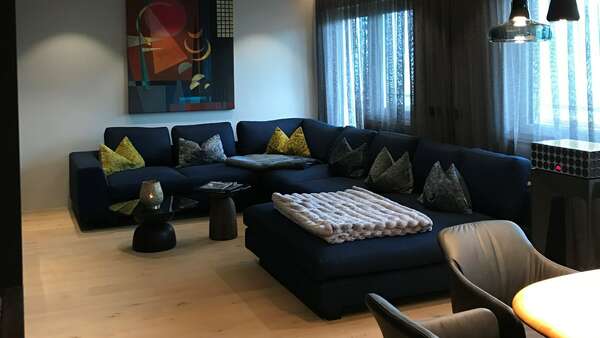 Die Designer Couch in einem dunkelblauen Stoff von Tommy M passt sensationell in den Raum.
