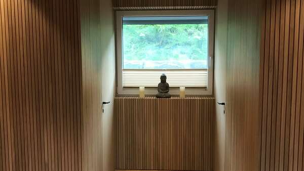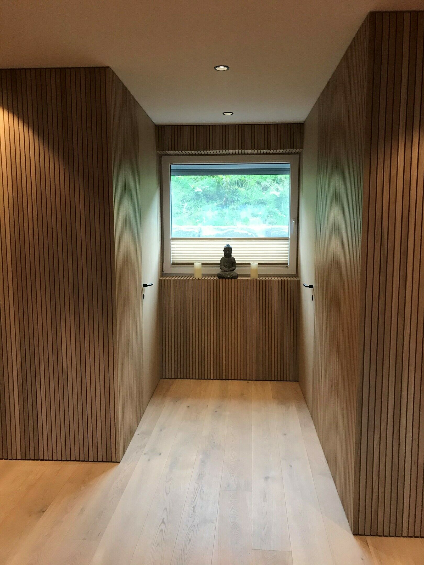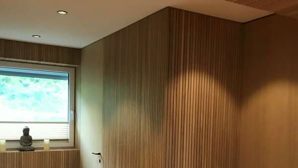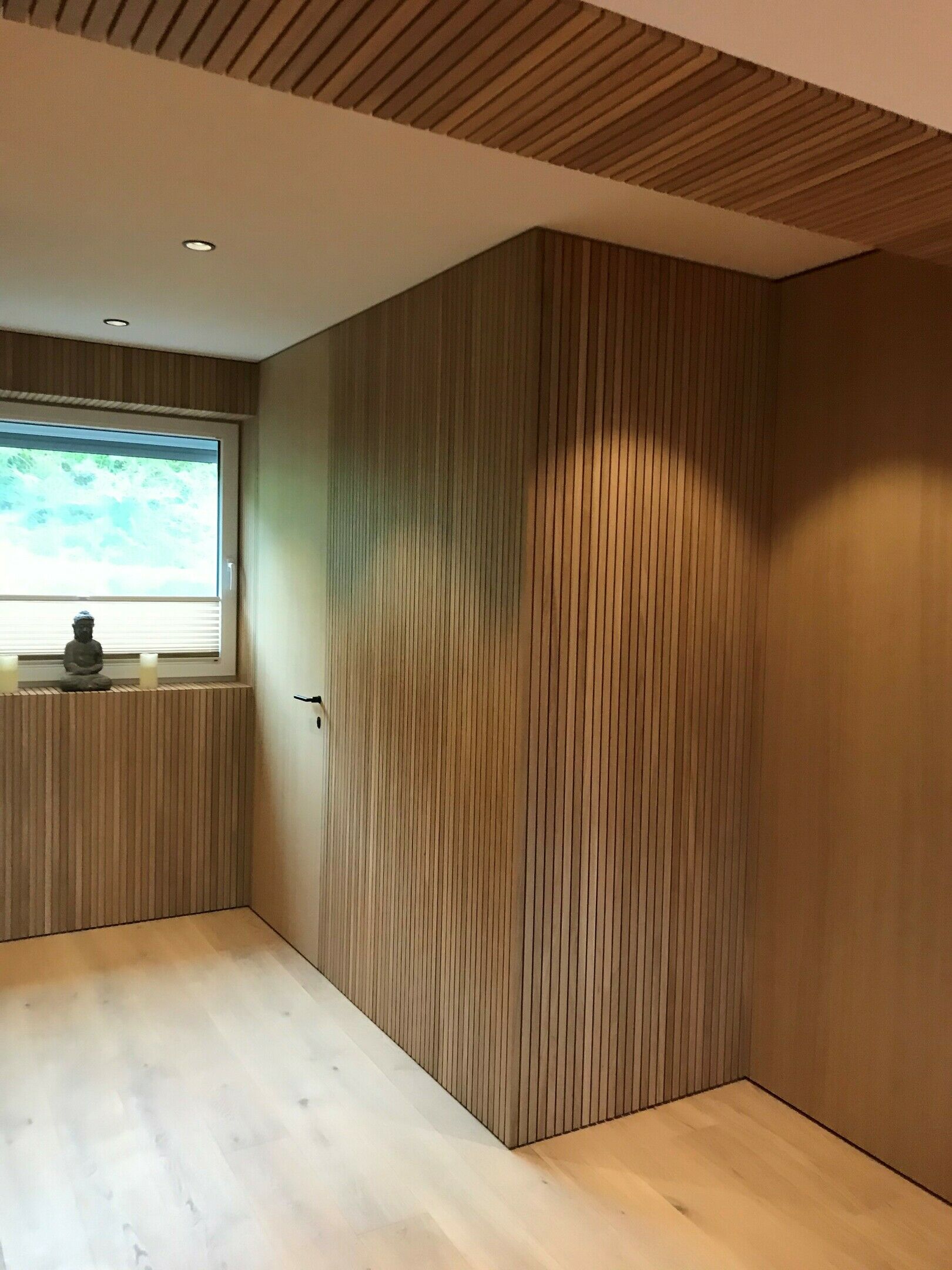 Ein weiteres Highlight ist der Vorraum mit seinen Sprossenwänden in Echtholz. Die Garderobe wurde bewusst hinter den Sprossen versteckt. Die Haustüre und die Innentüren wurden flächenbündig in die Sprossenwände eingebaut.