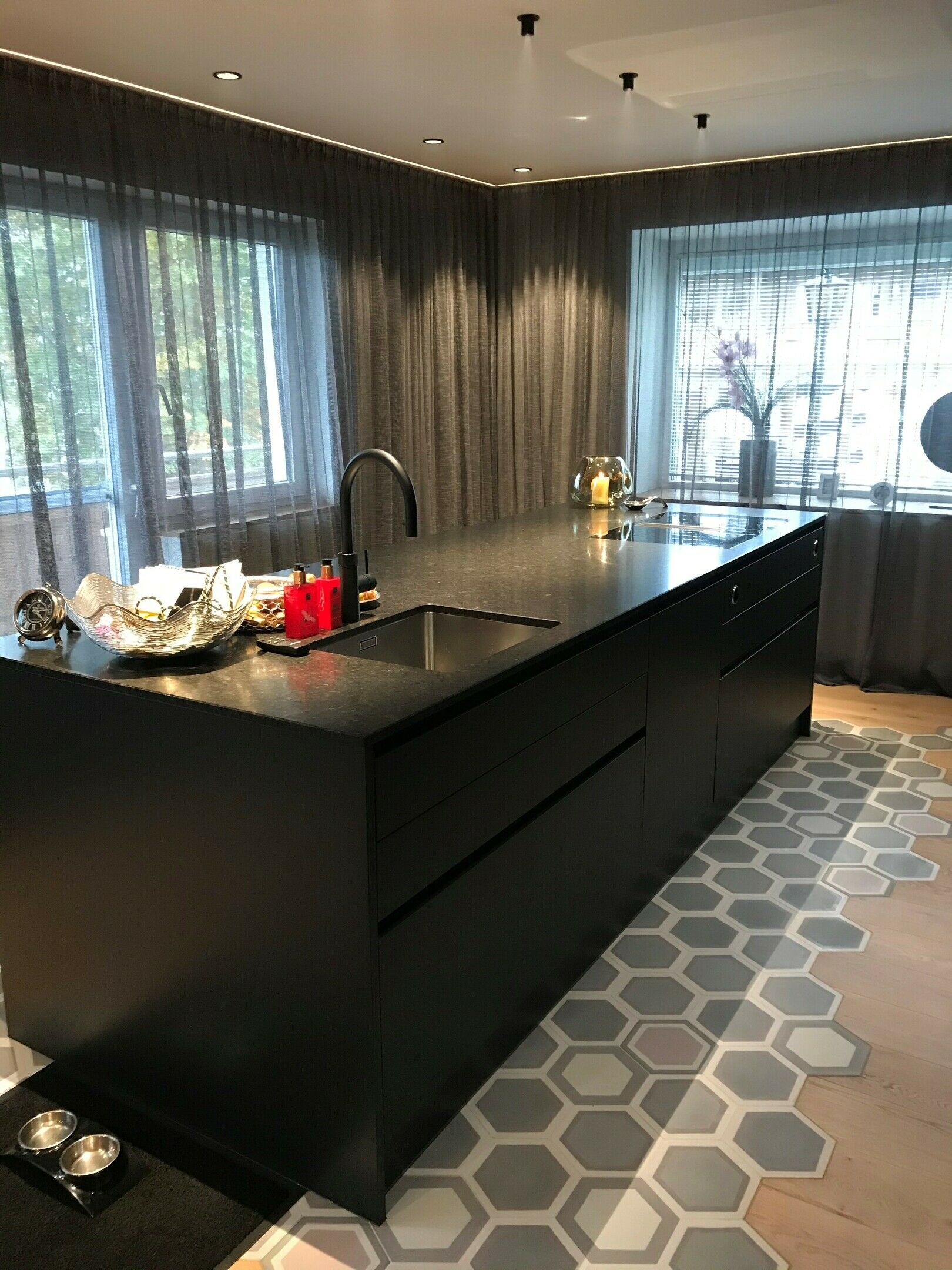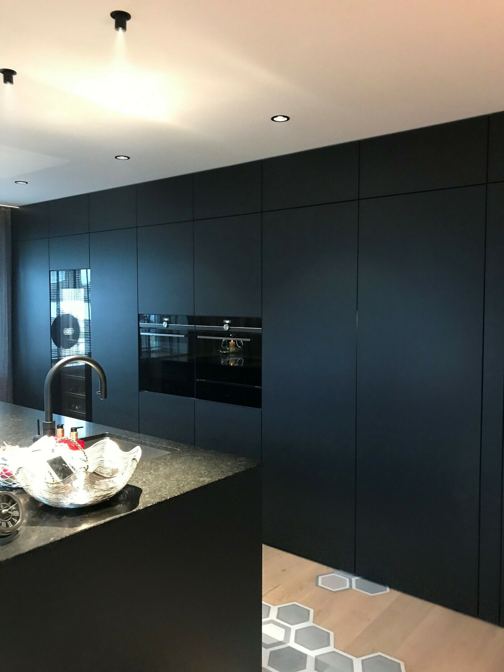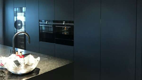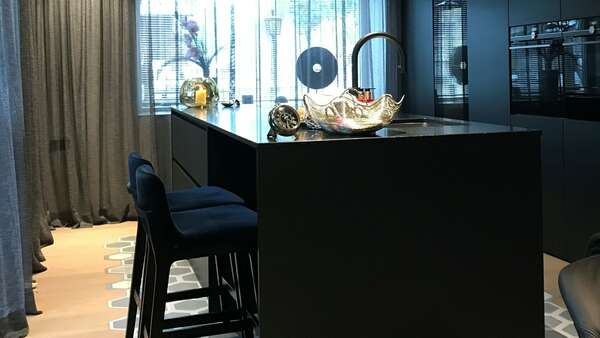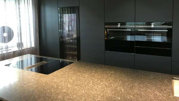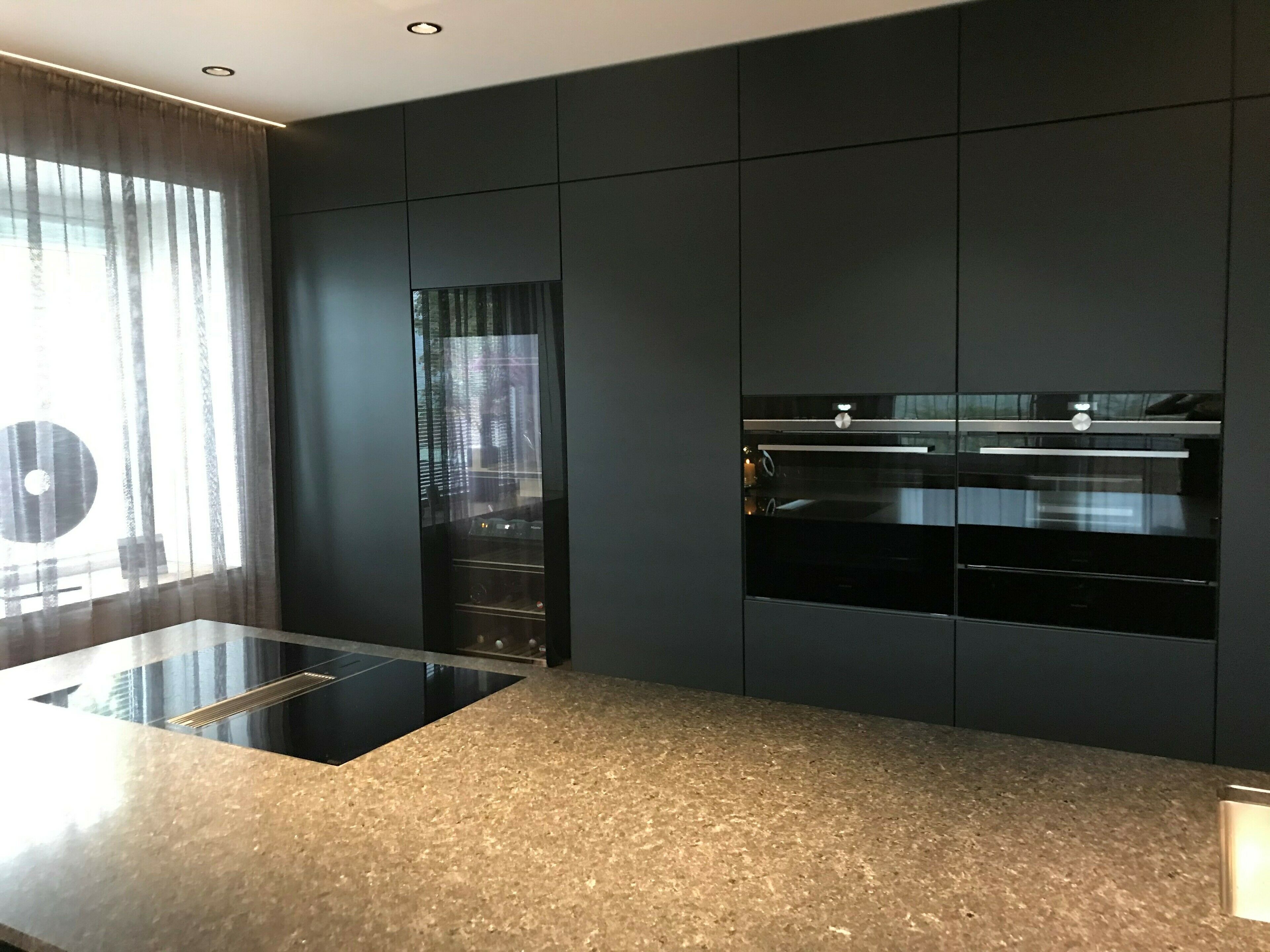 Sehr moderne Ewe Küche mit dunkler Granit Arbeitsplatte und Siemens Geräte. Fronten in einem speziellen Strukturlack in Schwarz-grau und versteckter zweiter kleiner Küche hinter den Kulissentüren. Ein Highlight ist der große Weinkühlschrank von Miele. Kleiner Sitzbereich befindet sich direkt auf der Hinterseite der Insel.