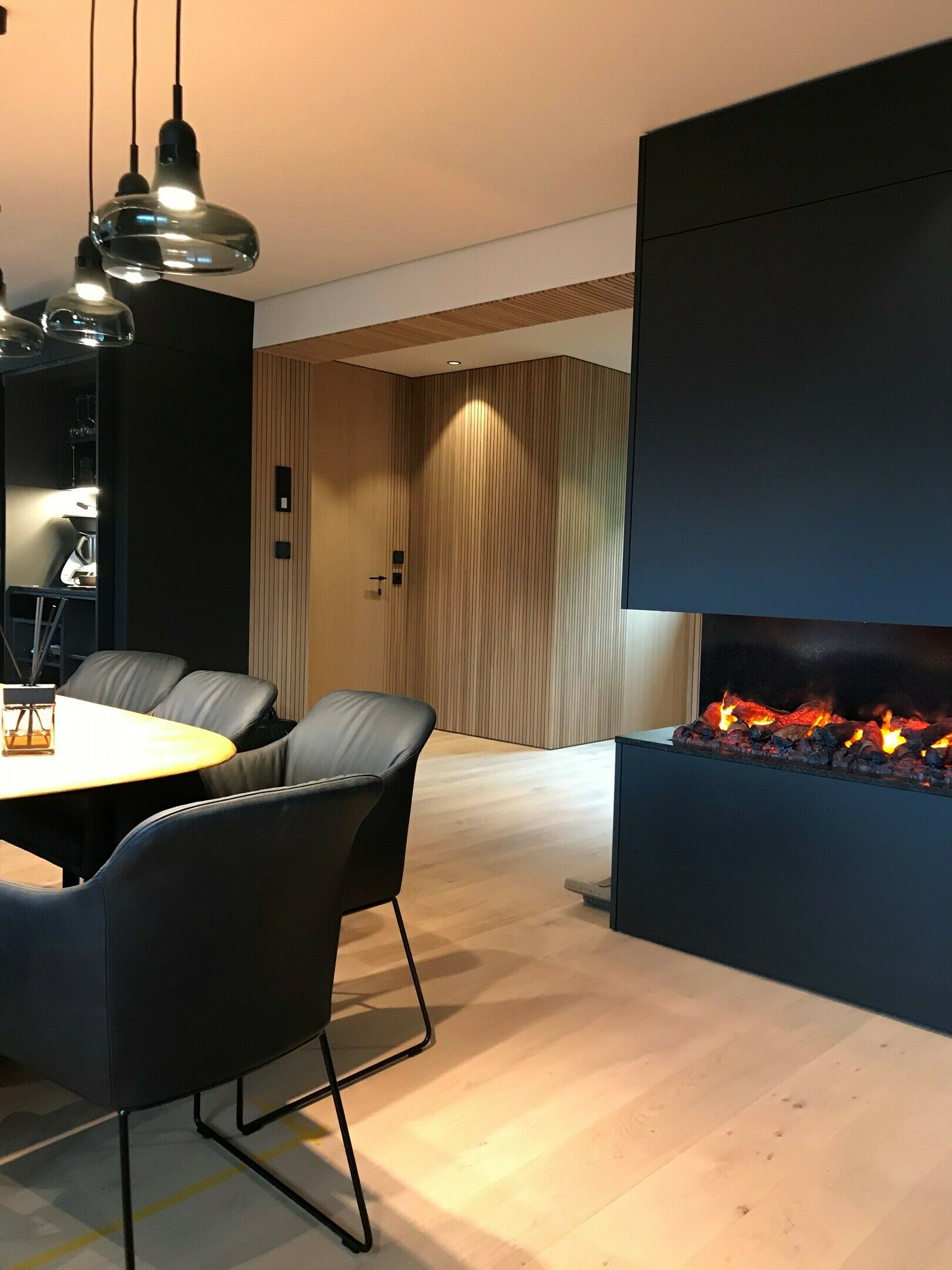 Elegante Gesamteinrichtung vom Vorhaus mit Sprossenwänden in Echtholz bis hin zum Wohnbereich mit Lackfronten.